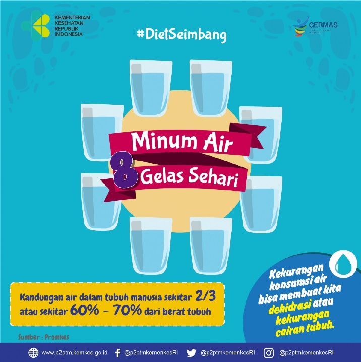 Pada orang dewasa, konsumsi air putih yang disarankan yaitu sekitar delapan gelas berukuran 230 ml per hari atau total 2 liter. Selain dari minuman, makanan juga dapat memberikan asupan cairan pada tubuh yaitu sekitar 20%.
